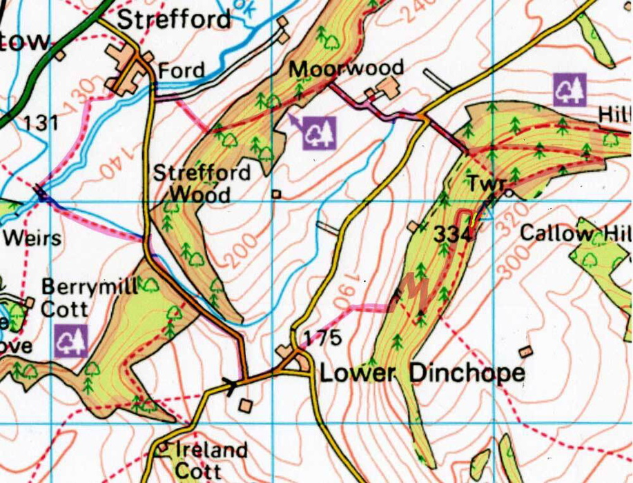 On entering Strefford Wood the gradients steepen. On reaching a hollow with a path crossing ignore a muddy path climbing through a deep cutting and instead follow a parallel one a few yards to the left (Note; Not the slimy wider track 20m to the left). This starts uncertainly but soon becomes clear as it takes you on an embankment overlooking the main path. As the cutting ends the routes join forces and the going gets easier, raking up to the top of Wenlock Edge. Leave the edge path for a pleasant hedge-lined farm track on the right. This eventually joins the tarred access lane from Moorwood Farm, which in turn leads to a country lane with a triangular grassy island. Turn right towards the afforested Callow Hill. At the first corner leave the lane to go straight ahead on a forestry road – there’s a Flounder’s Folly information sign here.