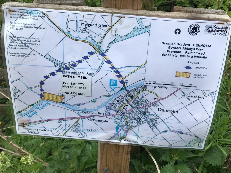 There is currently a short and well-signed diversion on Stage 4 (Jedburgh to Hawick). Just after leaving Denholm, a landslip by the Teviot means the route is diverted up the B6405 and then first left via Hassendean Bank, before continuing with the normal route at the bend in river. It adds around half a mile to the route.