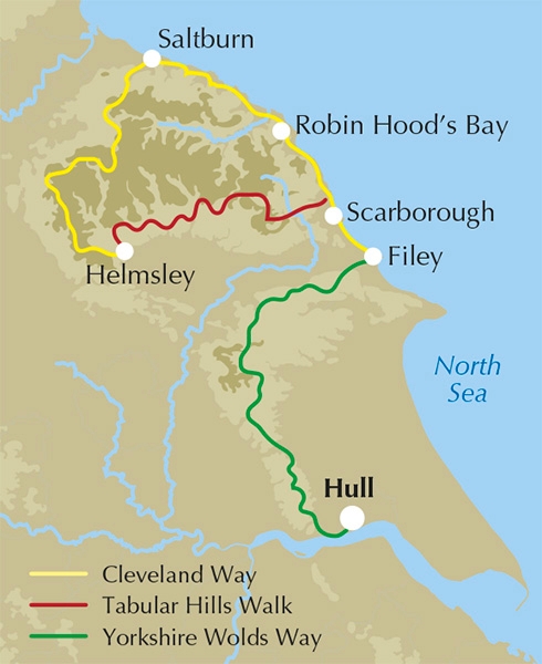 A walking guidebook to the Cleveland Way and Yorkshire Wolds Way National Trails, plus the Tabular Hills Walk. Crossing the North York Moors National Park, coastal scenery and quiet countryside, the three routes can be joined to create an easy circular route of over 250 miles (400km). Includes an OS 1:25K map booklet of the Cleveland Way.A guidebook to the Cleveland Way and Yorkshire Wolds Way National Trails and the Tabular Hills Walk. All set within the North York Moors National Park, these straightforward routes can be walked individually in about 1 week or combined to form a long-distance walk of 405km (252 miles) taking 3 weeks.