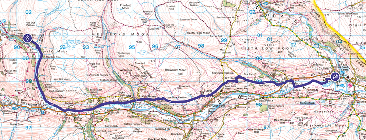 Between Gunnerside and Reeth, the low-level alternative that ran alongside the River Swale has been modified by moving it to a new line that keeps to higher ground on the north side of the Swale, re-joining the original riverside route at Healaugh.