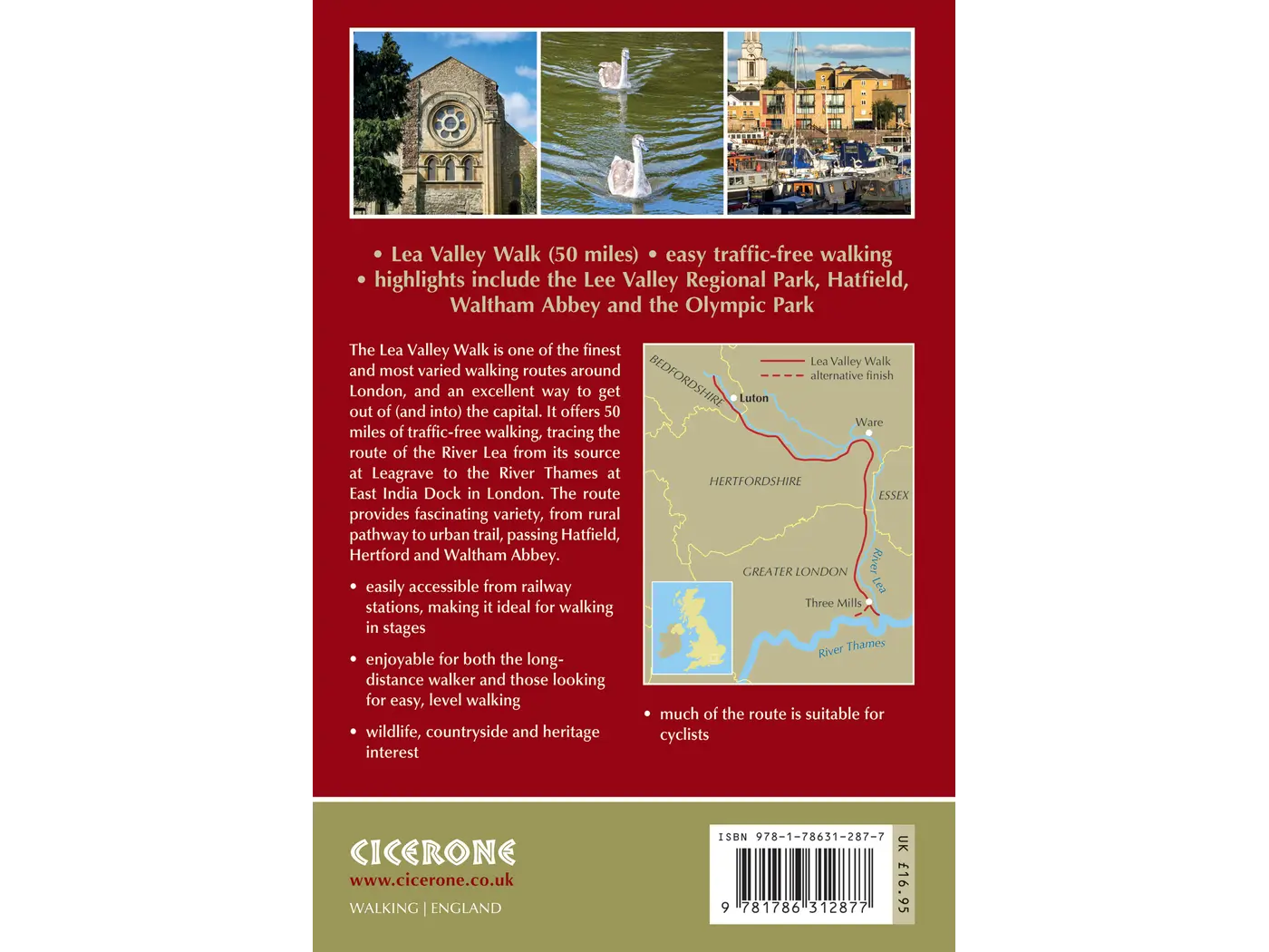 A guidebook to the Lea Valley Walk, a 50-mile route following the River Lea from its source near Leagrave to East India Dock. The route is almost entirely level and suitable for all abilities.