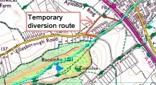 Stage 3 (p162): head up through Wendover as normal and after crossing the railway bridge turn right to follow the road over a temporary bridge. At the junction (zebra crossing), turn left for 150m and then turn right; now follow the Ridgeway up Bacombe Hill heading towards Coombe Hill.