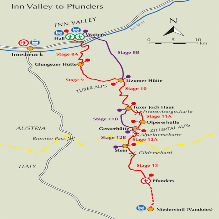 p.135: for a bad weather alternative to crossing the Gliderschartl (other spellings are available) consider taking the bus down the valley from St Jakob near Stein to Sterting, from where a train can be taken to Niedervintl and a bus to Pfunders (or use hotel in Niedervintl).