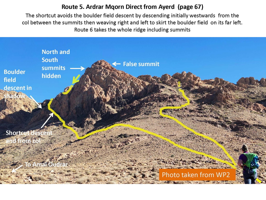 This update to pages 166-177 of the guidebook follows the appearance of some new paths and change in status of the Descent Route (page 169) so a revised description is provided below. The direct descent is still the fastest way down from the North Summit and was possibly once the accepted ‘trade route’ between the northern villages and Tagdicht.